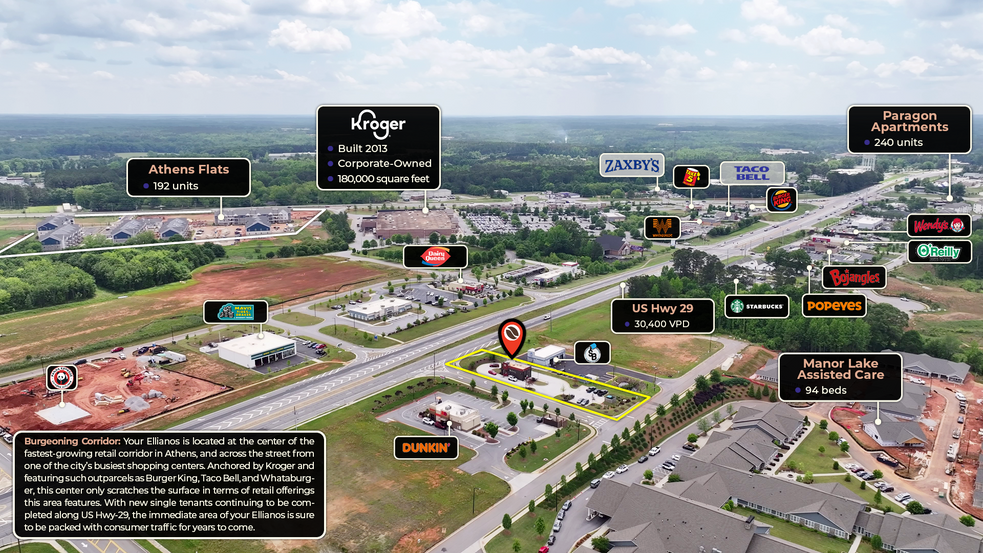 Ideal Stop into Athens: Ellianos is located on the right side of the road to benefit from copious traffic entering westbound into Athens. Whether it be for work commute or to the 41,000+ student University of Georgia, under five miles away.